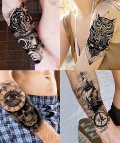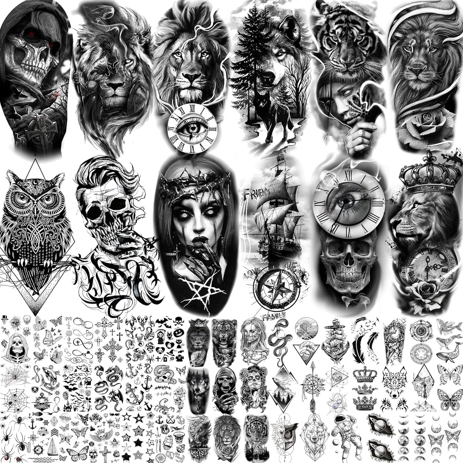 - 🍷59 Sheets Temporary Tattoos Sticker Fashion Designs🍸 EGMBGM Brand Original Evil Demon Devil Skull Scary Skeleton Owl Animals Lion Tiger Wolf Pirate Ship Boat Butterfly infinity Anchor Snake Scorpion Mountain Dragon Bat Whale Shark Spiderweb Spider Star Gothic Feather Birds Temporary Tattoos For Adults. There Are 12 Sheets 21×11.5CM 8.2″x4.5″ Large Arm Sleeve Tattoos For Men and 47 Sheets 10.5x6CM 4.1″x2.3″ Fun Cute Tiny Small Temporary Tattoos For Women In Each Package.